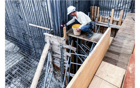 ▲《恆山首恆》地下二樓頂板模板組立(左)和鋼筋綁紮後的混凝土澆置作業(右),