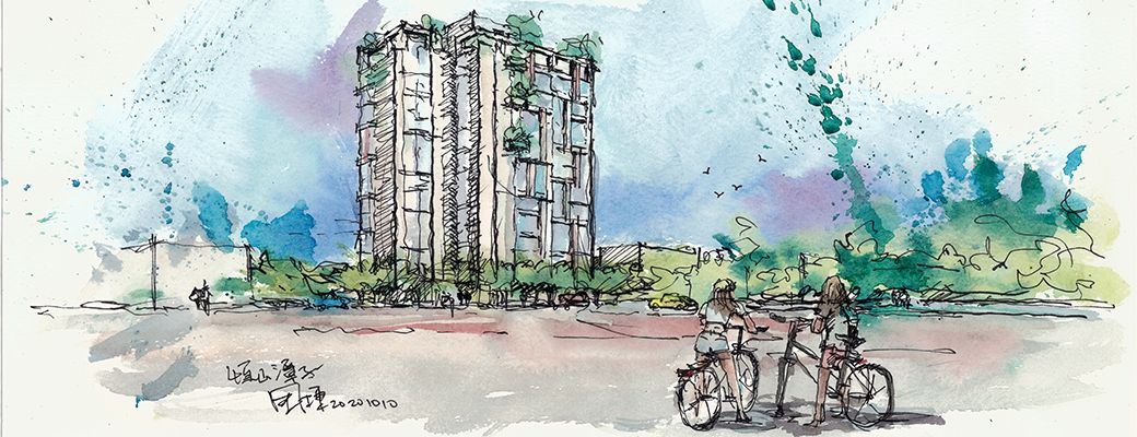 基地三向開放街廓,我們創造了讓光與風流動的空間和開闊的視野,讓每戶格局都有充足陽光與舒適尺度。為了使鄰里關係更能互動相融,我們在街廓退縮的基地內造了一座以三合院埕為概念的廣場式水池前庭,延續視覺景深,如同在地著名古蹟《摘星山莊》門樓內一片平坦寬闊的前埕,埕前有一泓半月池及一片蒼翠的綠林,行經於此都能享受濃密綠意與一池寧靜。公設規劃上,以共享空間人文質感為本案定調,空間機能用途豐富,輔以在地文化精神之陣列式穿廊,嘗試連結自地歷史與未來,讓住所成為生活的容器。